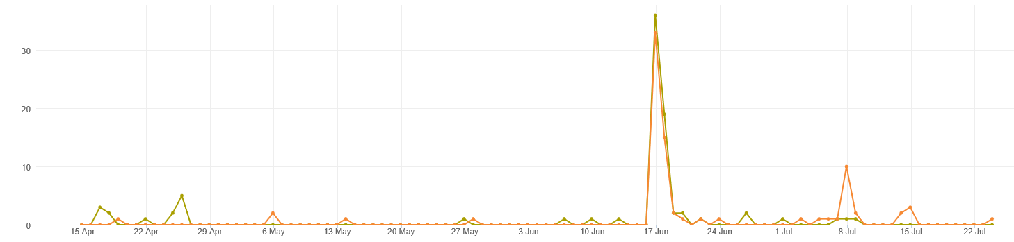 Given that there is conflicting information we wanted to see whose idea and data wins out – the Centre for Economic Policy Research (CEPR) or Bertelsmann Foundation (BF)? To do this we looked to see which study was referenced most. The chart below shows the mentions of each organization within the TTIP/TAFTA conversation over the last 100 days. The Center for Economic Policy Research is in orange and the Bertelsmann Foundation is in green.