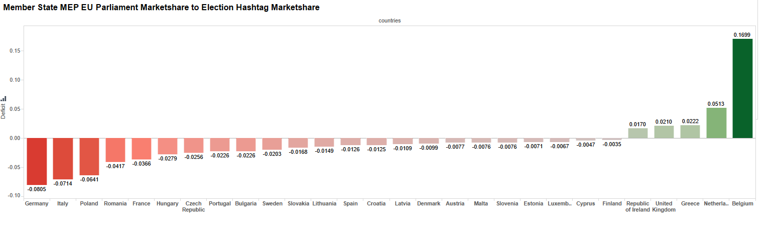 In the present day, 2014, not much has changed. Although hash-tags are probably not the most precise KPIs and leave a bit to be desired (I needed something quick), the data shows that in proportion to German MEP market share, Germany is still the most disengaged country when it comes to mentioning on EU election-specific hash-tags. What was telling was that Greece had just 62 fewer mentions than Germany, despite Germany being about seven times the size. In fact, only five member states were a net positive (including Greece). Belgium ranked first, obviously, because Brussels is home to most of the EU institutions. The “Brussels Bubble” is alive and well, even though this time it was supposed to be different.