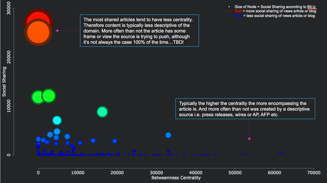 Enter networks. This enables an understanding of how things connect to and exist at a level that is not possible to do with standard KPIs like volume, publish count and sentiment over time. Through mapping out the network based on entities, extracted locations, and similar text and language characteristics it’s possible to map coordinates of how a headline, entities or article exists and connects to other entities within the specific domain. In turn, this creates an analog of the physical world with stunning accuracy – since more information is reported online every day. For example, using to online news articles and Bit.ly link data, I found articles with less centrality (based on the linguistic similarity of the aggregated on-topic news article) to their domain, which denote variables being left out (of the article), typically got shared the most on social channels. In short, articles that were narrower in focus, and therefore less representative of the broader domain, tended to be shared… This is just the tip of the iceberg.