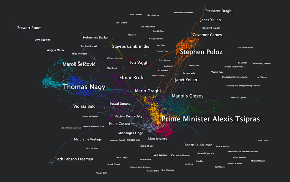 The bar chart below shows which topics within the European Parliament domain are associated with each person. The people are represented by the colors from the network graph above. It’s in hierarchical form based on centrality (to the European Parliament).