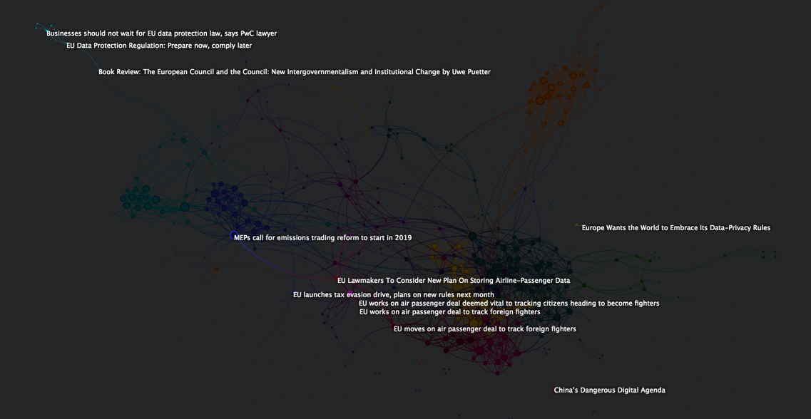 While the issues are on the edge of EU affairs, as indicated at the top left and bottom right of the network graph below (highlighted in the teal green and dark red), data issues are becoming embedded within the broader scope of the EU Parliament. Note that the range is across network centrality. This indicates that policies will have to be negotiated within a multitude of domains.